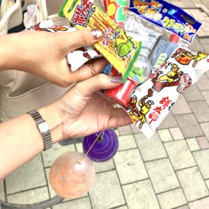 大人二人で並び、おもちゃとお菓子を