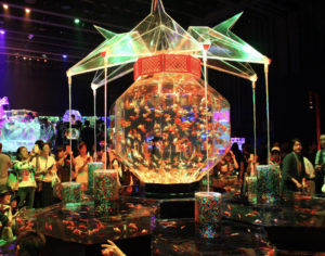 不思議な水槽で色鮮やかに輝く金魚たちが